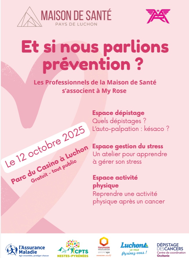 La Maison de Santé du Pays de Luchon, en partenariat avec l’association ELLES, le CRCDC 31, Harmonie Mutuelle et la CPAM, organise un stand de prévention Octobre Rose le dimanche 12 octobre 2025 au Parc du Casino à Luchon.